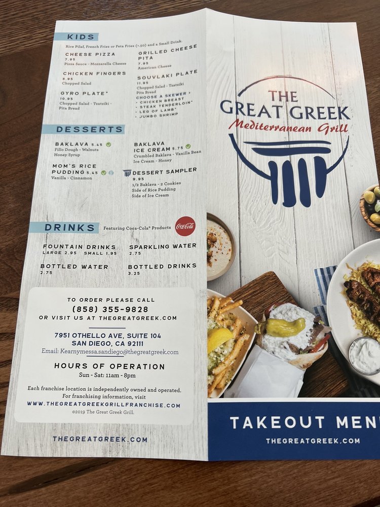 Welcome to The Great Greek Mediterranean Grill in San Diego, CA, where authentic Greek flavors come alive! This charming eatery, located at 7951 Othello Ave Suite 104, serves up delicious Mediterranean dishes that have diners raving. Start your culinary journey with mouthwatering appetizers like Avgolemono soup, tangy Tzatziki, and spicy Tirokafteri. The fresh Hummus and Melitzanosalata showcase traditional ingredients at their finest.
